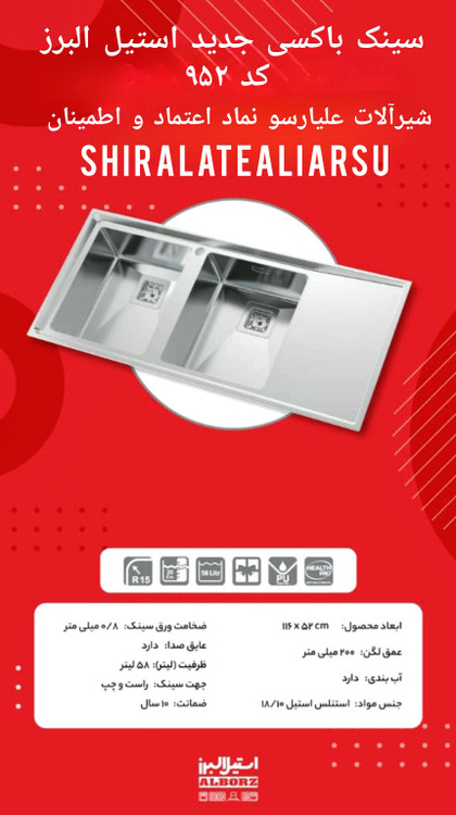 سینک فانتزی توکار باکسی استيل البرز *کد ۹۵۲ * سایز ۵۲×۱۱۶ * عمق ۲۰۰میلیمتر * جنس مواد استنلس استیل ۱۸/۱۰ * ضخامت ورق ۰/۸میلیمتر * ظرفیت لگن ۵۸ لیتر * آب بندی دارد * عایق صدا دارد * جهت سینک چپ و راست * ضمانت ۱۰سال *: ۱۰