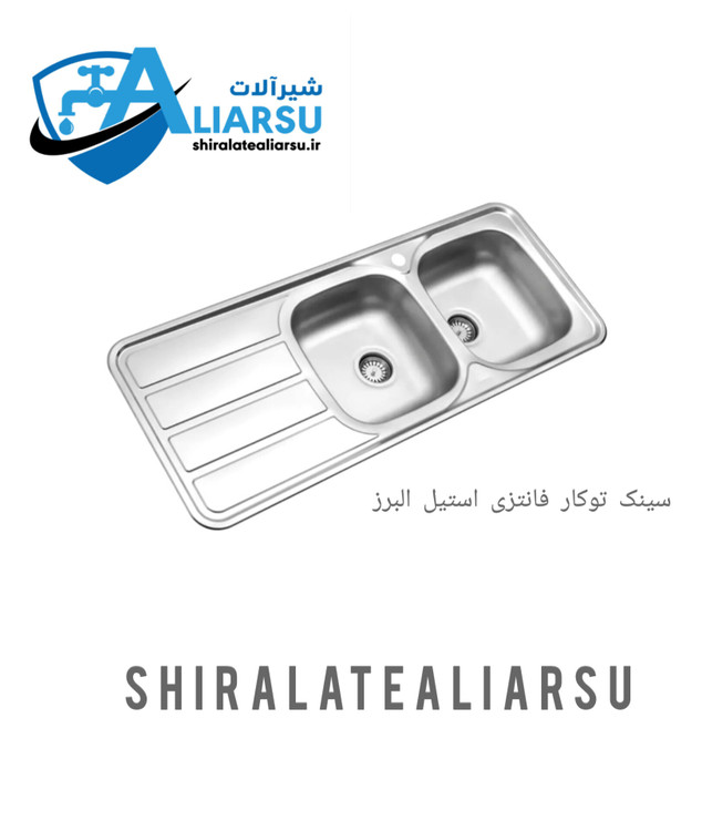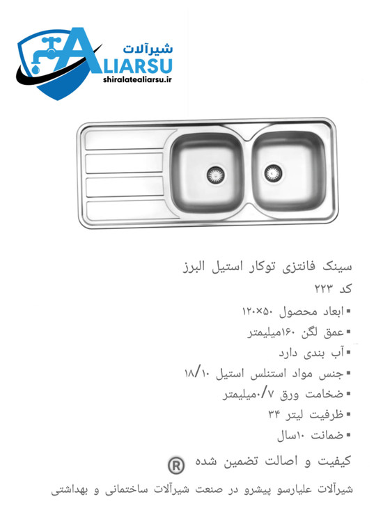 سینک ظرفشویی آشپزخانه نیمه فانتزی توکار استیل البرز کد ۲23 چپ و راست عمق لگن ۱۵۰ میلیمتر ضخامت ورق ۶ میلیمتر ۱۰ سال گارانتی