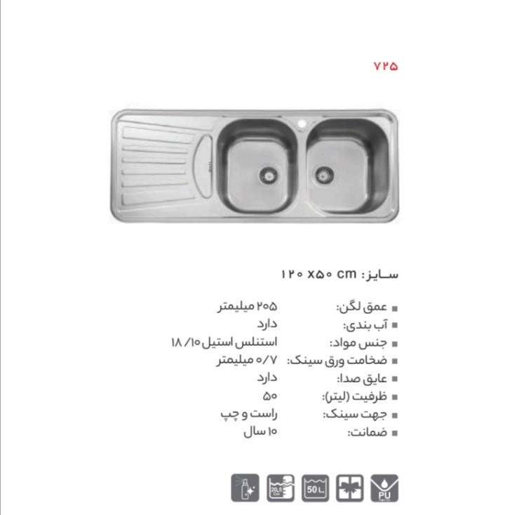سینک ظرفشویی آشپزخانه فانتزی توکار استیل البرز کد ۷۲۵ سایز ۱۲۰/۵۰cm ▪️عمق لگن ۲۰۵ ▪️ آب بندی دارد ▪️ جنس مواد استنلس استیل 18/۱۰ ▪️ ضخامت ورق سینک ۰/۸ میلیمتر ▪️ عایق صدا دارد ▪️ ظرفیت لیتر 50 ▪️ جهت سینک چپ و راست ▪️ ضمانت ۱۰ سال