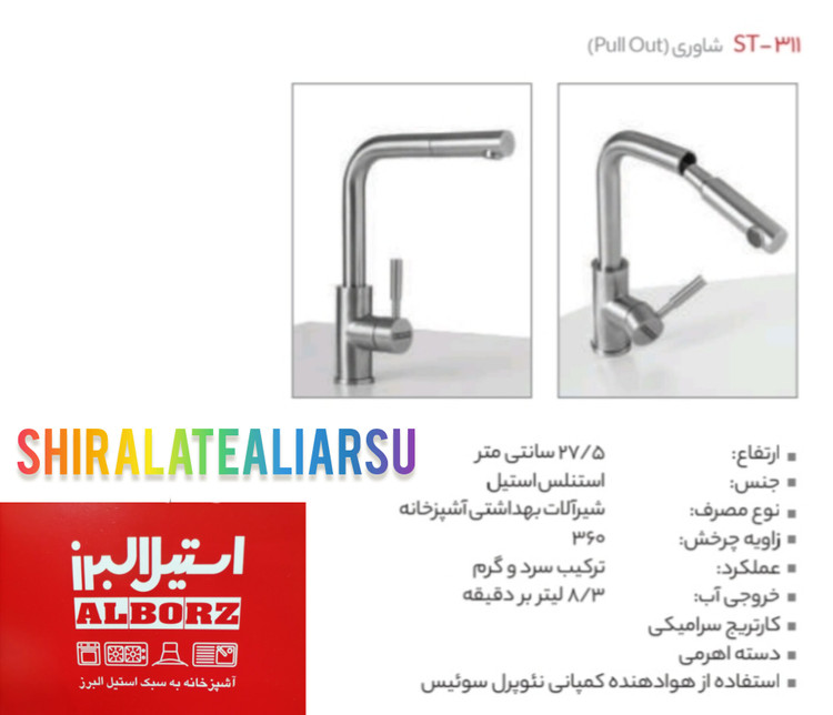 شیر سینک شاوری استیل البرز:کدST311: رنگ استیل مات: ارتفاع ۲۷/۵ سانتیمتر: جنس استنلس استیل نوع مصرف سینک آشپزخانه: زاویه چرخش ۳۶۰ گارانتی معتبر ۵ساله